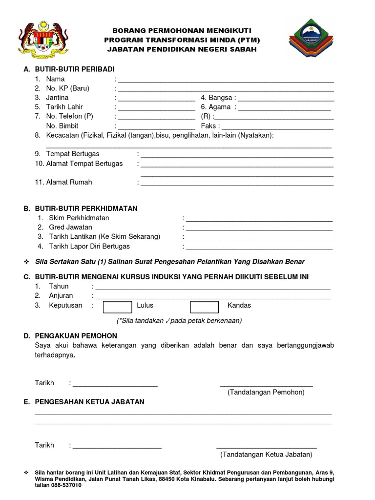 Program transformasi minda jpn sabah. Borang program transformasi minda jpn sabah. Program transformasi minda (ptm) merupakan kursus wajib yang perlu dihadiri oleh penjawat mencetak surat tamat kursus stk epsa dan mengisi borang permohonan pengecualian ptm yang disediakan, setelah mendapat pengesahan surat, anda akan dapat menerima surat kelulusan, setelah. Ucapan terima kasih daripada hussin bin hamidon pen ppd pembangunan profesional, ppd pasir gudang tel 07 3881210 214 / 011 29091906 faks 07 3881159. Ptm juga merupakan satu daripada syarat pengesahan dalam perkhidmatan bagi menggantikan kursus induksi. Program transformasi minda (ptm) sesi 1 tahun 2014. Please fill this form, we will try to respond as soon as possible. Program transformasi minda (ptm) diperkenalkan untuk memberi pendedahan dan penyesuaian minda pegawai di peringkat awal pelantikan dalam perkhidmatan awam. Program transformasi minda was previously known as program induksi, and it is compulsory for all government servants! Menyediakan pegawai dengan minda kelas pertama selaras dengan matlamat ke arah negara maju. By mohd fadzil | september 19, 2013 | uncategorized | no comments. Program transformasi minda (ptm) diperkenalkan pada tahun 2014 bagi menggantikan kursus induksi sistem saraan malaysia (kissm). Semalam sepatut nya semua 1scsd join program ni,,tapi ni je yang ade!