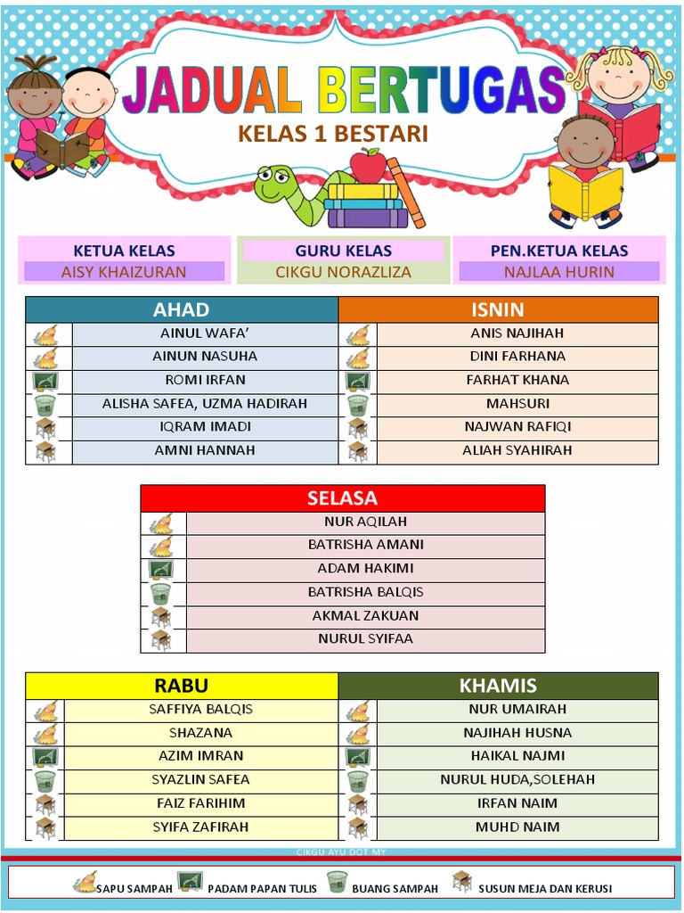 Jadual Bertugas Kelas Boleh Edit - Contoh jadual bertugas dan boleh diedit.cara mudah mengubahsuai contoh jadual bertugas kelasanda hanya perlu menukar nama, sekolah dan kami sedar tidak banyak perkongsian dibuat untuk jadual bertugas boleh diedit kerana kebanyakannya disediakan dalam bahan yang tidak.. Di sini admin tunjukkan contoh yang telah dikongsikan oleh cikgu mai ismail, anda boleh save gambar dibawah, dan edit sendiri guna power point atau publisher. See more ideas about insects theme preschool, insects theme, insects preschool. Jadual bertugas pelajar 2 ibnu battuta (2019) tugas hari memadam papan tulis menyapu lantai menyusun kerusi dan meja membuang sampah ahad isnin selasa rabu khamis. 13 best jadual bertugas kelas images in 2018 education teacher. Jadual guru bertugas mingguan 2012